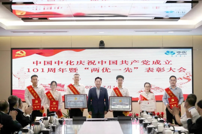 7月1日,中国中化在京召开庆祝中国共产党成立101周年暨“两优一先”表彰大会,热烈庆祝中国共产党成立101周年,表彰公司各级党组织涌现出的“两优一先”先进集体和个人。中国中化党组书记、董事长宁高宁以“迎难而上、砥砺奋进,做稳经济的国家队主力军,以优异成绩迎接党的二十大胜利召开”为题作专题党课,号召广大党员干部职工深入学习贯彻习近平新时代中国特色社会主义思想,坚决捍卫“两个确立”,不断增强“四个意识”,坚定“四个自信”,做到“两个维护”,积极推动习近平总书记重要指示批示精神落实落地,全力以赴“稳增长、防风险、促改革、强党建”,切实履行中央企业政治、经济、社会三大责任,奋力建设世界一流的综合性化工企业,以优异成绩迎接党的二十大胜利召开。中国中化党组副书记、董事、总经理李凡荣主持会议。