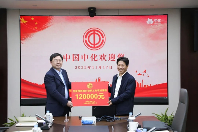 中国能源化学地质工会是中华全国总工会领导下的指导我国煤炭、电力、石油、石化、化工、医药、国土资源系统工会工作的全国产业工会组织。为了表达全国总工会对公司员工的关心关爱,蔡毅德代表中华全国总工会向受新冠疫情影响的我司旗下企业送来12万元慰问金。在北化机电解槽车间进行现场调研时,蔡毅德倾听一线职工心声,鼓励广大职工立足本职岗位,为能源化学工业贡献产业工人的一份力量。